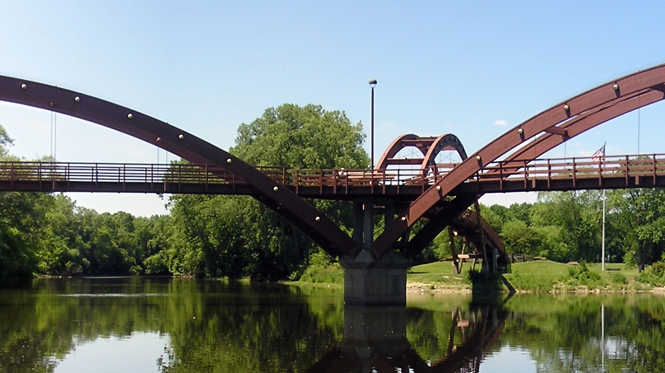 The Tridge (short for ‘triple bridge’) is a three-way footbridge which spans the Chippewa and Tittabawassee Rivers. Though the bridge is primarily for foot traffic, rollerblades and skateboards are also allowed. The Tridge is a popular hangout for local teenagers, due to its location near downtown and adjacent to a skate park. It is also located near the Midland farmers market and is a focal point of Midland’s summer concert series. The Tridge is a popular tourist attraction in the area.